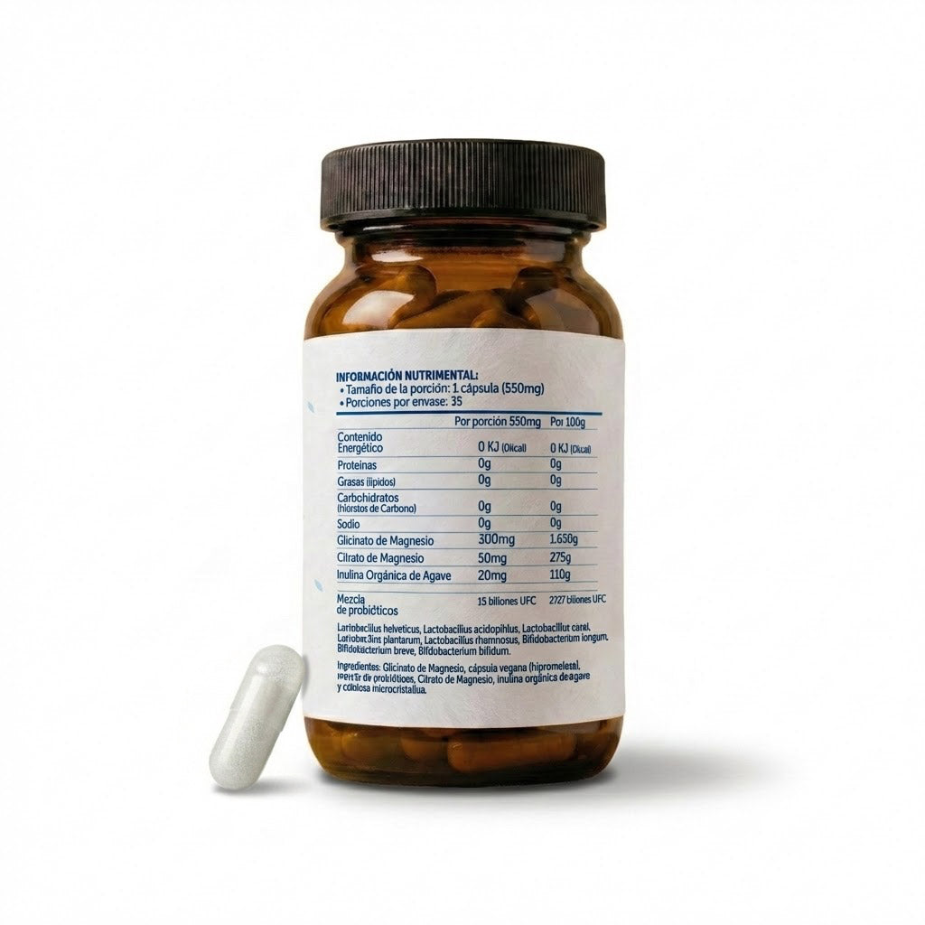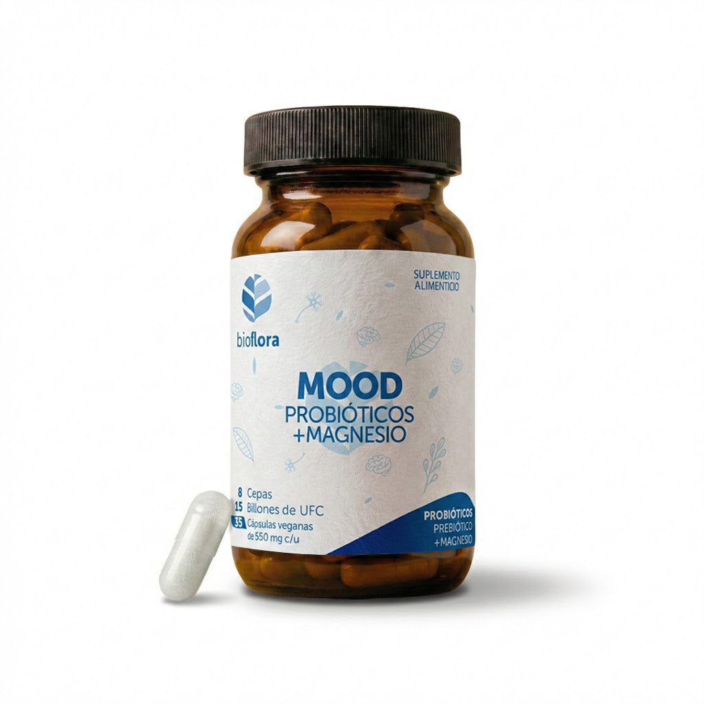Bioflora MOOD es un suplemento avanzado que combina 8 cepas de probióticos, prebióticos y Magnesio (Citrato y Glicinato) para apoyar el estado de ánimo, la calidad del sueño, la salud digestiva y la respuesta al estrés. Incluye 15 billones de UFC por porción y 35 cápsulas veganas libres de soya, gluten, OGM y lácteos.